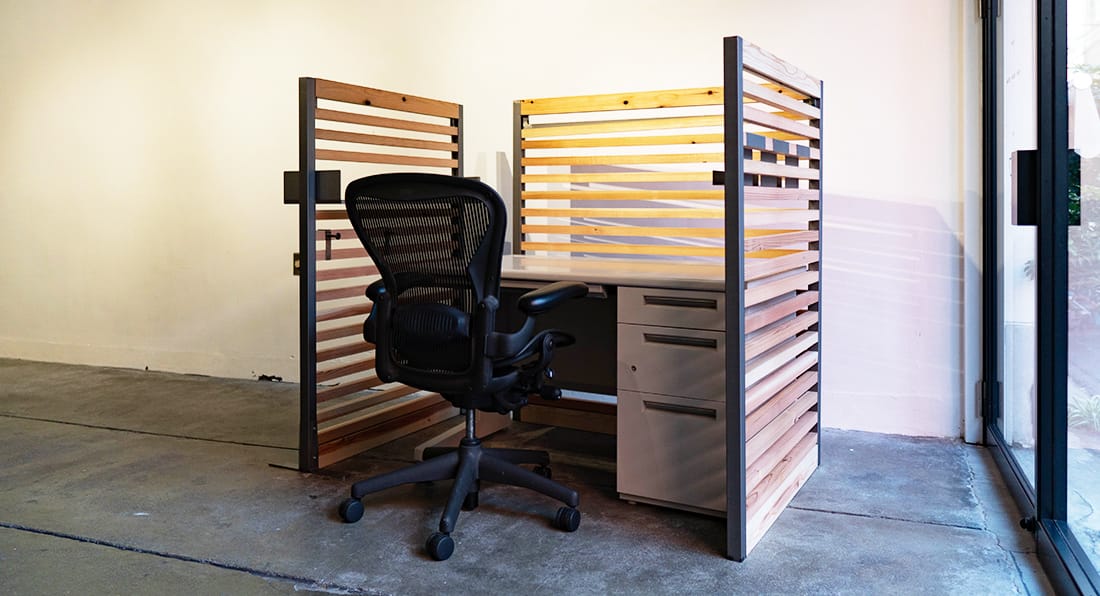 シンプルな木と鉄のデザインが無機質なオフィス空間をハイブリッドに彩り、適度な開放度のある間仕切りとしてバランスの良い空間演出をご提案させて頂きます。