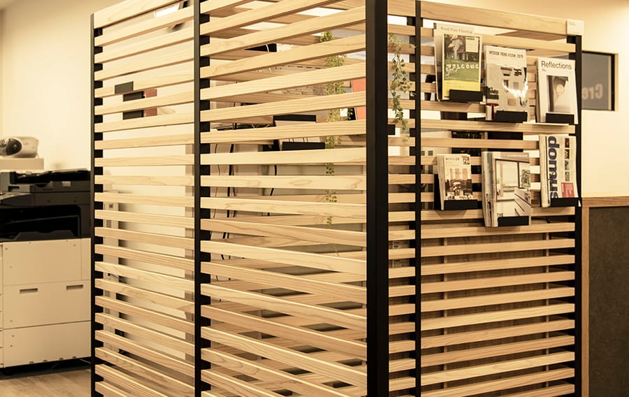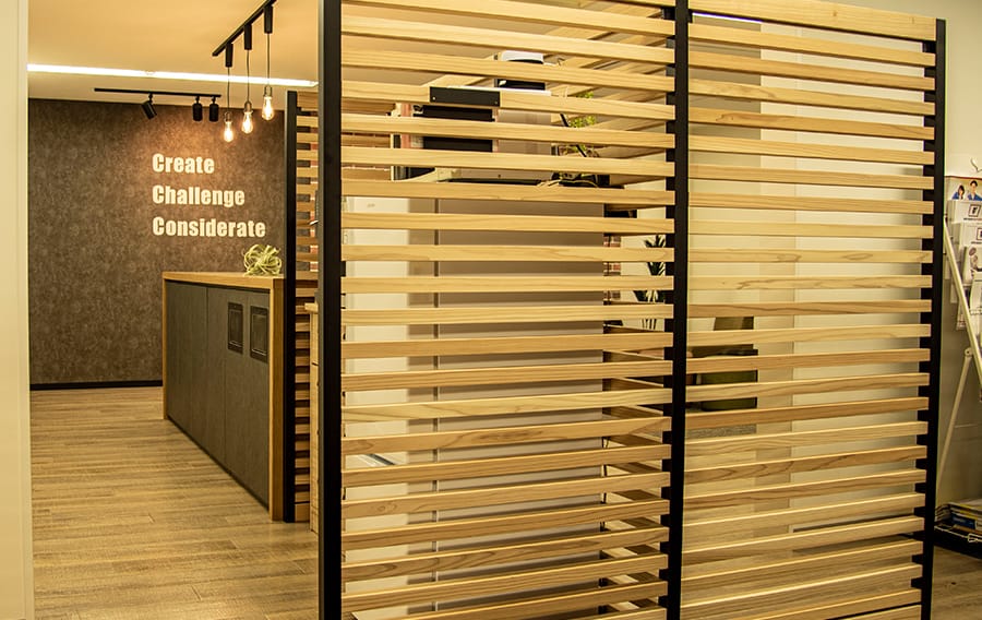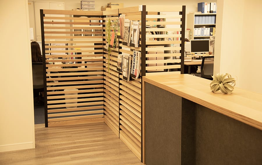 株式会社紅中様オフィス間仕切りとして株式会社紅中様の神戸事業所に間仕切りとしてご採用いただきました。 当家具の魅力を十二分に引き出して頂いた空間になっております。 適度な開放度、写真からでも木のほのかな良い香りが伝わってきます。