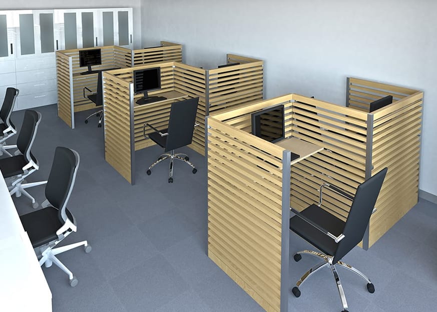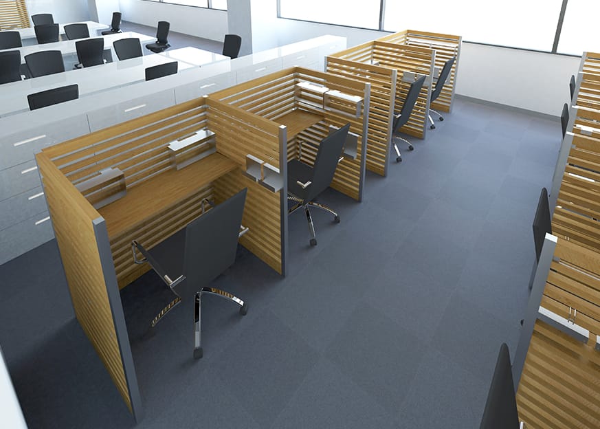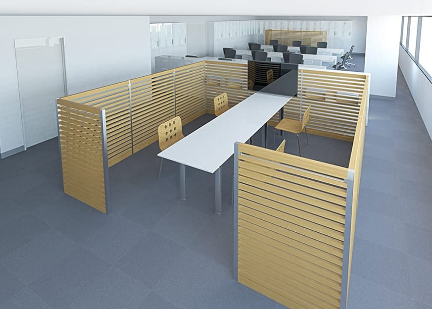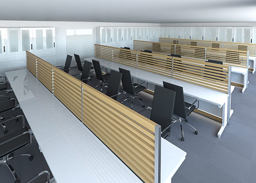 対面デスクのパーテーションとしての使用。目線を程よく遮ってプライバシーを確保。ほのかな自然木の香りの効果でデスクワークに集中できる環境を作り、生産性を向上させます。また、オプションパーツの小棚を付ければ書類や小物の整理整頓に役立ちます。