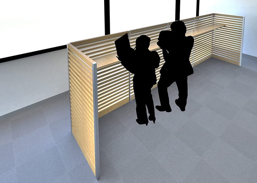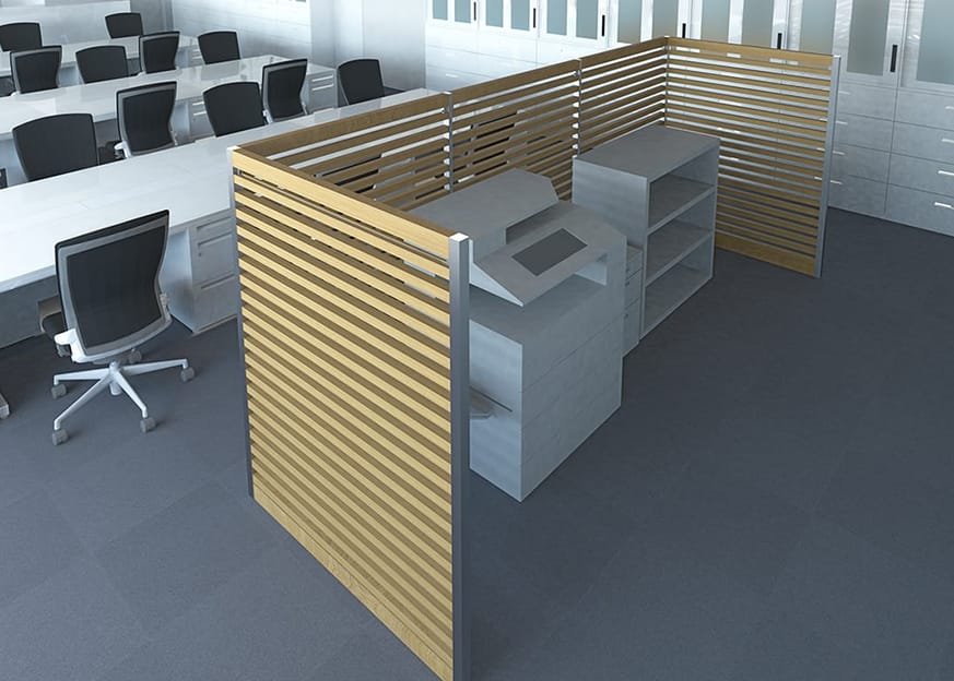コピー機、FAX、キャビネットなどの備品の目隠しとして使用。オフィスをすっきりとした快適な空間へ刷新します。退屈なコピー取りの作業時間も自然木の香りによってリラックスタイムへ。 オプションパーツによって棚を設置し、コピー用紙などの備品の収納も可能です。